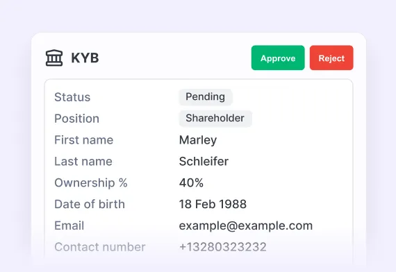 Support KYB/AML and CTF requirements with structured data collection and automated verification workflows - helping you reduce regulatory risk, avoid fines, and protect your reputation.
