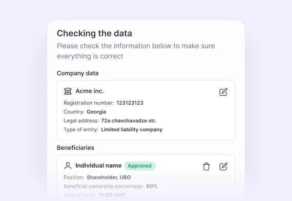 KYB usually requires company identification details, management and representation data, ownership and beneficiary information, and a description of business activity. Depending on risk level and regulation, additional verification against official registries or trusted data sources may also be required.