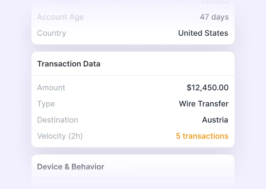 Looks for behavior often associated with fraud, such as device changes, bot or emulator use, dormant-account abuse, and suspicious device-switching before transfers.