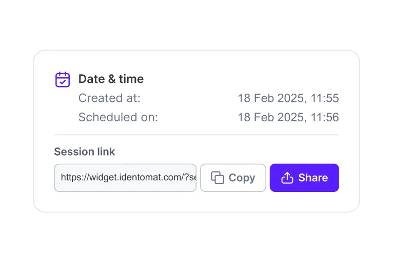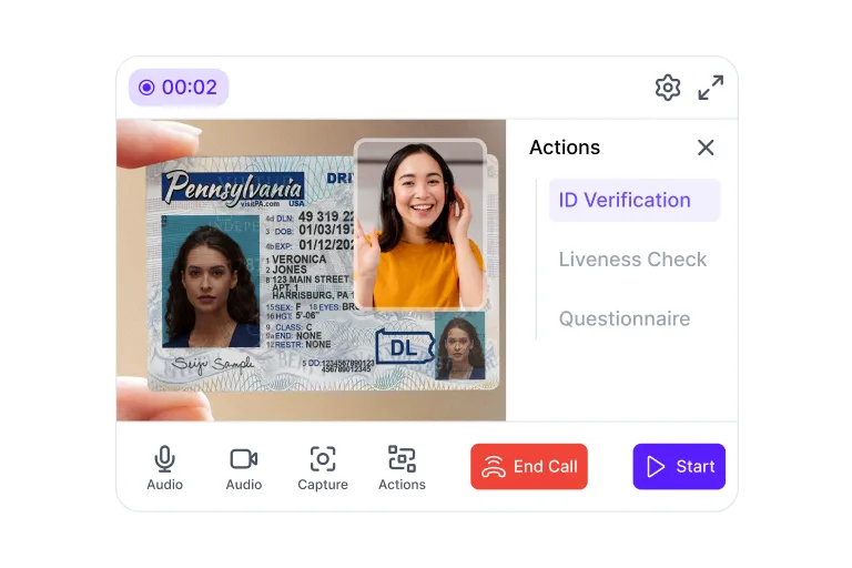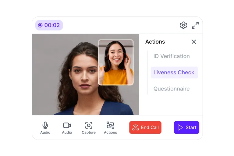 Run a secure live video verification session with an agent and the customer (two-party), or verify multiple participants in a single call (multi-party) - while keeping the same compliance-grade checks, evidence capture, and audit trail.
